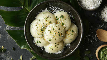 Delight in soft steaming rice cakes served with a vibrant green sauce, elegantly arranged on a leafy backdrop for a fresh and appetizing presentation.