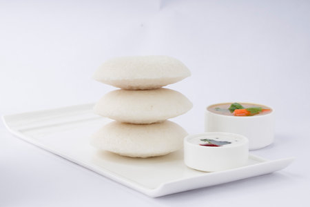 Idly or Idli, south indian main breakfast item garnished with red dry chilli and curry leaves which is beautifully arranged on white rectangle base on white textured background.