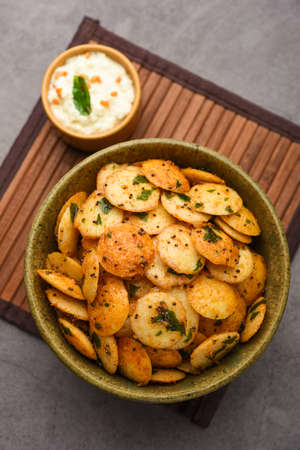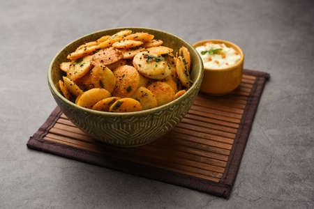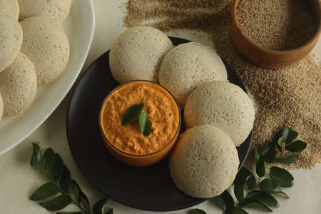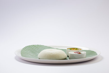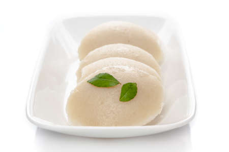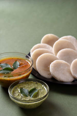 Close-up of fresh rava Idli or Idly with green curry leav is a popular south Indian food, served with coconut chutney. selective focus
