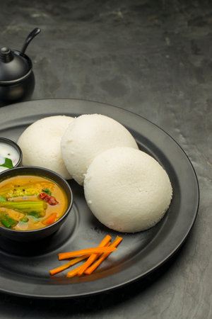 Idly or Idli, south indian main breakfast item which is beautifully arranged in a black plate with grey coloured texture with kitchen background.