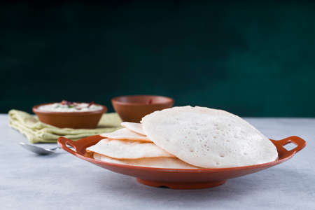 South Indian traditional breakfast Dosa or Thattu dosa made using cast iron dosa thawa, arranged in a tableware with side dish white coconut chutney and onion chutney on white textured background.
