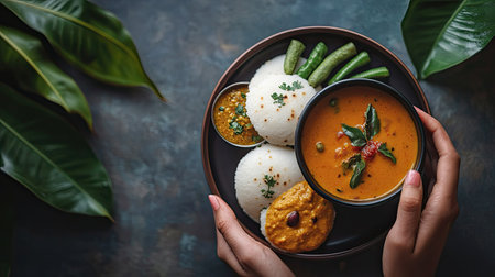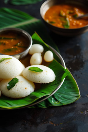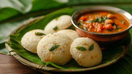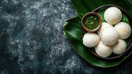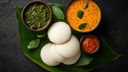 South Indian breakfast of soft idlis, spicy sambar, and coconut chutney on a banana leaf. Top view with room for text.