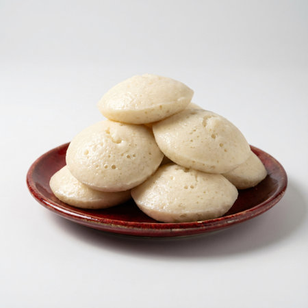 An elegant serving of idlis on a simple plate, set against a neutral backdrop that creates a clear area for marketing