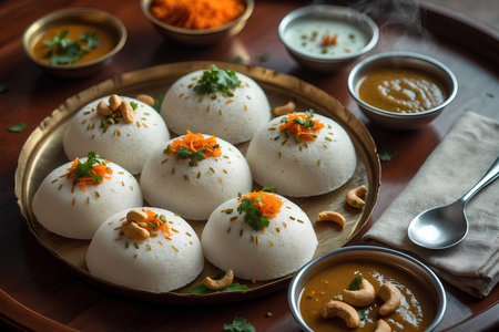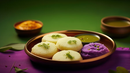 A beautiful arrangement of steamed rice cakes served with fresh green chutney. This traditional dish highlights the simplicity and flavor of Indian cuisine.