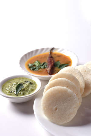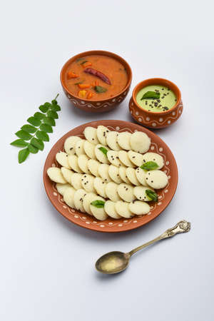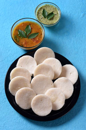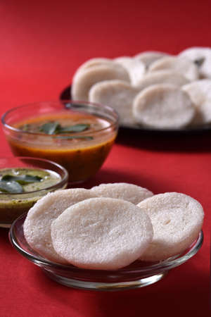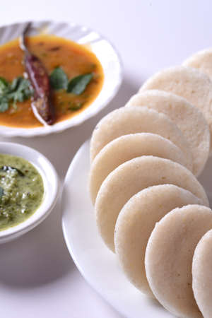 Idli or idly is a healthy Indian, vegetarian, traditional and popular steam cooked rice cakes served with bowls of chutney and sambar as side dishes.selective focus