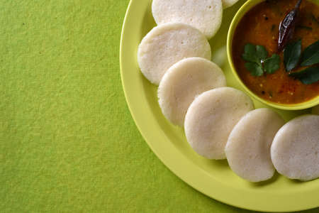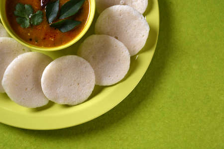 Idli with Sambar in bowl on green background, Indian Dish : south Indian favourite food rava idli or semolina idly or rava idly, served with sambar and green coconut chutney.