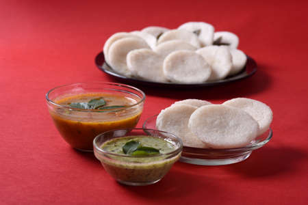 Idli with Sambar and coconut chutney on red background, Indian Dish : south Indian favourite food rava idli or semolina idly or rava idly, served with sambar and green chutney.