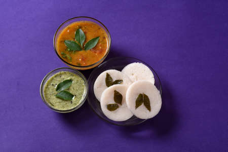 Idli with Sambar and coconut chutney on violet background, Indian Dish : south Indian favourite food rava idli or semolina idly or rava idly, served with sambar and green chutney.
