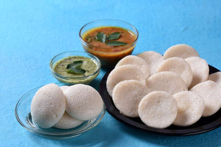 Idli with Sambar and coconut chutney on blue background, Indian Dish : south Indian favourite food rava idli or semolina idly or rava idly, served with sambar and green coconut chutney.