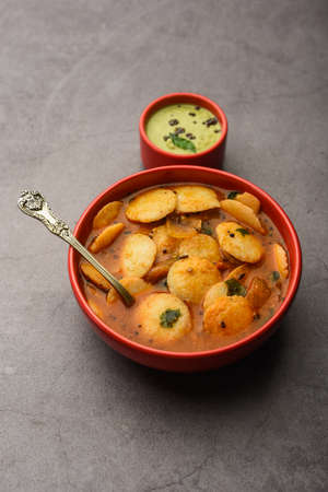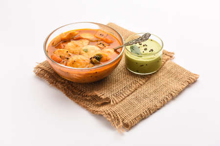 South Indian snacks idli sambar or idly sambhar prepared by steaming fermented rice and served with coconut dip and vegetable soup. Close up.
