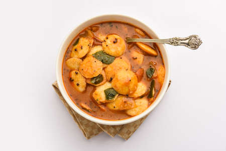 Idly with Indian style spicy Mutton or Lamb curry, Portrait view