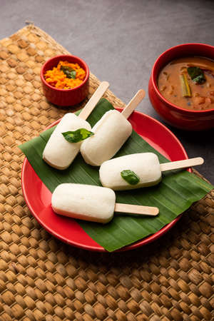 Idly lollipop or idli candy with stick served with sambar and chutney,South indian breakfast