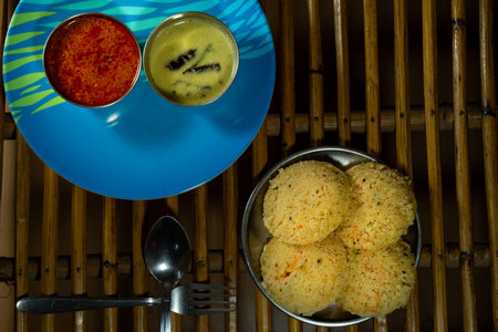 Rava idli served with chutney and sambar, a soft and fluffy breakfast option. Top view with copy space.