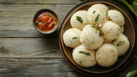 A close-up of fluffy idlis on a rustic wooden table, with a small bowl of tangy chutney, leaving plenty of room around the dish for promotional messages or captions.