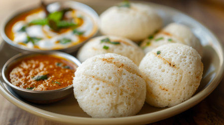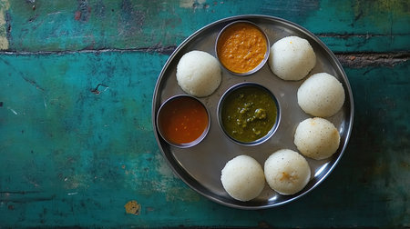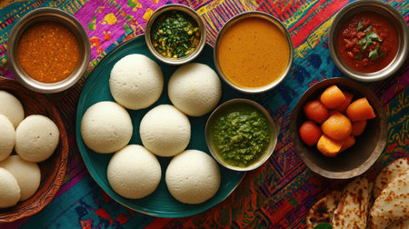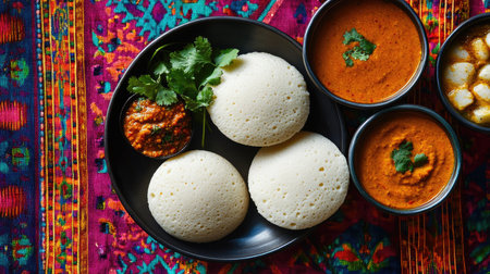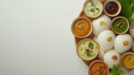 A vibrant presentation of idlis with assorted dips, set against a clean background that allows for ample space for promotional messages or branding.