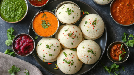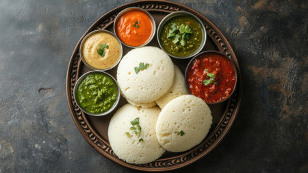 Overhead shot of freshly steamed idlis arranged on a decorative plate, served with an assortment of colorful chutneys