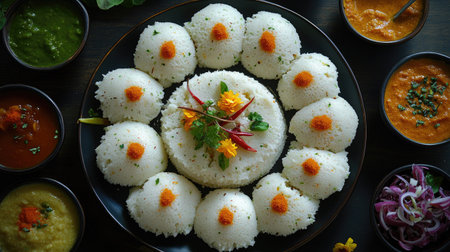 Aerial shot of fluffy idlis arranged neatly on a plate, surrounded by colorful sauces and garnishes, creating a visually appealing and appetizing presentation.