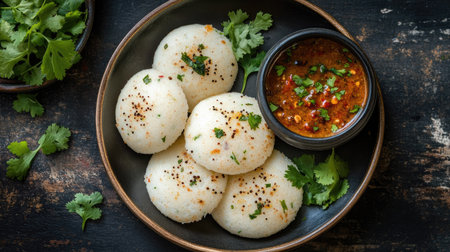 Top view of a traditional serving of idlis with a side of spicy chutneys, garnished with fresh cilantro, showcasing the textures
