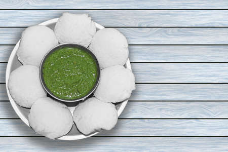A popular south Indian food Idli with coriander mint chutney