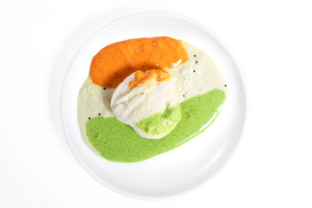 A white plate with soft idlis served with green, orange and white chutneys, arranged in a tri-color presentation. Perfect for a traditional Indian breakfast.