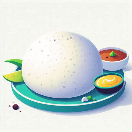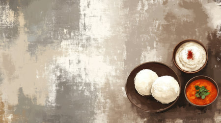 A vibrant depiction of a traditional South Indian breakfast with fluffy steamed idli, accompanied by creamy coconut chutney, spicy sambar, and fresh yogurt, inviting a delightful culinary experience.