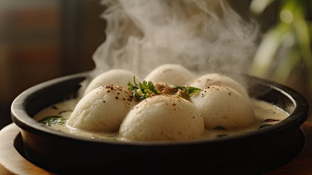 Enjoy a beautifully presented plate of hot idli, a traditional Indian dish, garnished with herbs. Perfect for breakfast or a light snack.