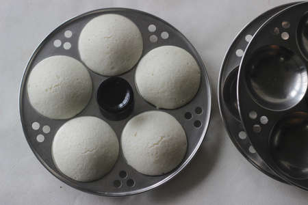 Steamed rice lentil cake inside the mould. Steamed rice cake is popularly known as Idly in India. The mould is used to get the round shape. Shot on a white background.
