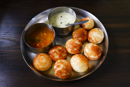 A high angle shot of delicious Paddu on a metallic plate on the table