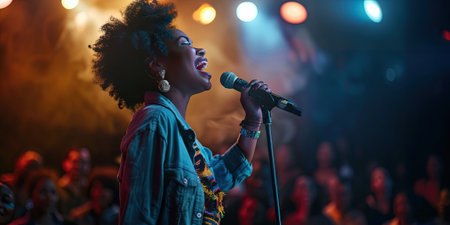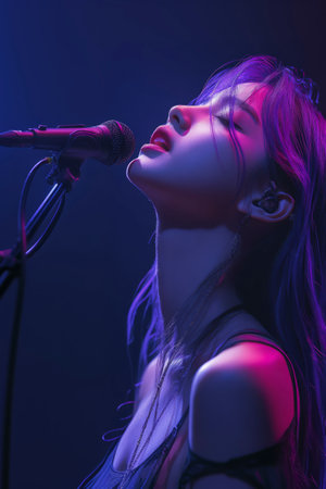 Young woman singing passionately into microphone under colorful stage lights
