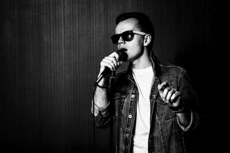 Young Guy in Sunglasses and Jeans Jacket Singing with Microphone. Singer Performance. Concert and Music Concept. Dark Background. Black and White Photo.