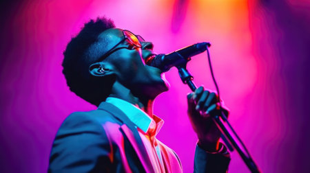 African american male singer performing on stage in nightclub with colorful lights