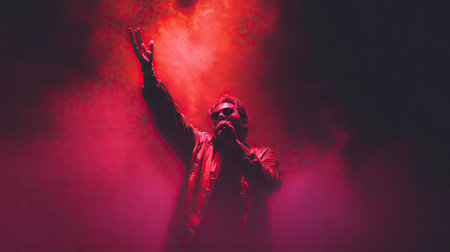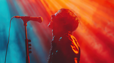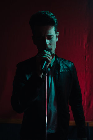 Close up portrait Rock band vocalist singing to microphone in lights on red background