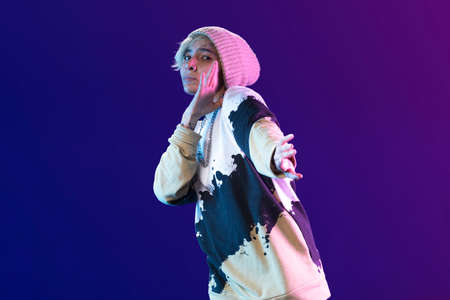 Young african-american musician singing on gradient orange-purple studio background in neon light. Concept of music, hobby, festival. Joyful party host, stand upper. Colorful portrait of artist.