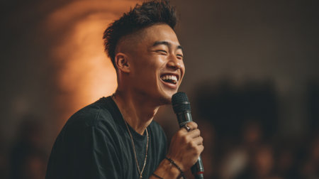 A cheerful young man engages with listeners sharing laughter and positivity in a lively gathering.