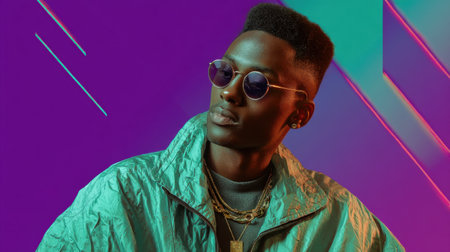 A fashionable man models stylish sunglasses while wearing a shiny jacket and layered necklaces. The colorful backdrop features bright purple and teal elements, enhancing its modern look