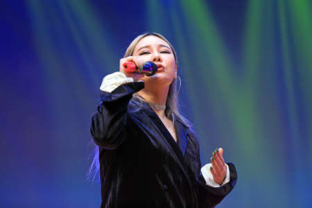 Asian woman singing on concert stage, singer artist
