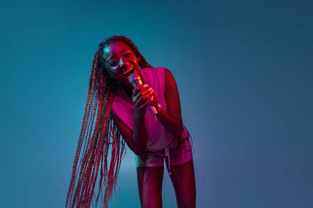 Portrait of young charming african woman with microphone isolated over blue background in neon lights. Concept of facial expression and human emotion.