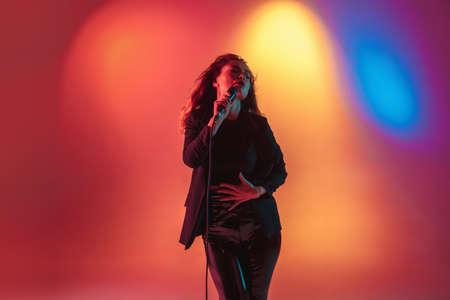Caucasian female singer portrait isolated on orange studio background in neon light. Beautiful female model in casual style with microphone. Concept of human emotions