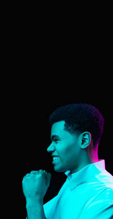 Winning. African-american mans portrait on black studio background in multicolored neon light. Beautiful male model. Concept of human emotions, facial expression, sales, ad, fashion. Copyspace. Flyer