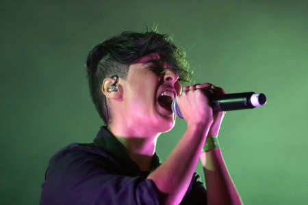 A rock singer singing on stage with a microphone. The musician performs on stage.