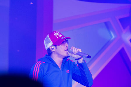 An asian male singer showing his porformance on stage. Entertainment and Concert Concept.