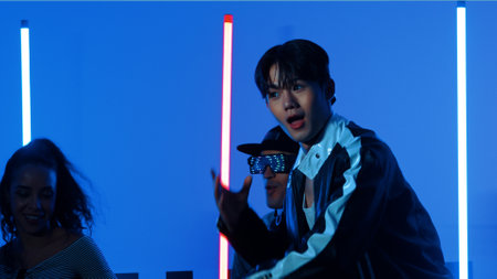 Happy hispanic girl with casual shirt dancing together with diverse break dancer with neon light. Professional street dancer moving to freestyle music with led light at house and party. Regalement.