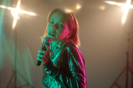 Portrait of beautiful young woman singing to microphone on stage while performing music, copy space