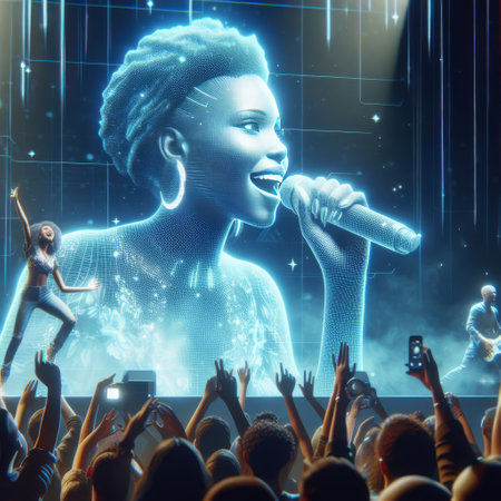 An electrifying virtual concert featuring a holographic singer performing on stage with a live band and an enthusiastic crowd. This image showcases the blend of live music and digital technology.. AI Generation