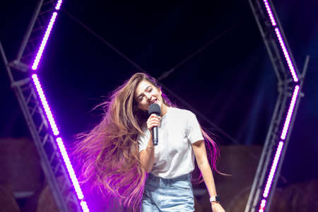 Belarus, Avtyuki village, July 31, 2021. Celebration of culture. A girl with long hair sings on stage.
