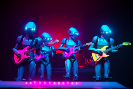 Group of robot playing guitars on stage at music concert with neon lights. Generative AI.