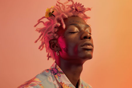 Colorful man with pink hair and flowers looking up at camera in artistic portrait