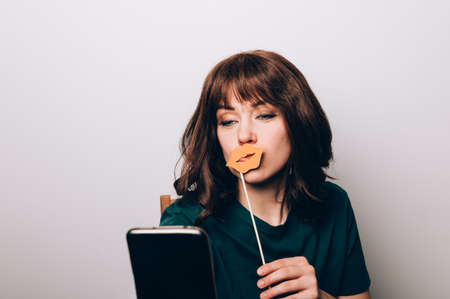 A woman closes her eyes with a smartphone, with a picture of huge cartoon eyes. The concept of hiding identity and fake pages in social networks.