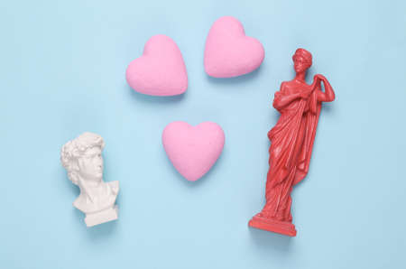 Love, romantic concept. Antique busts with hearts on a blue background
