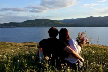 Loving couple on top of the mountain. Embrace. Sunset. A young girl with long hair and her boyfriend. Love. Man and woman.